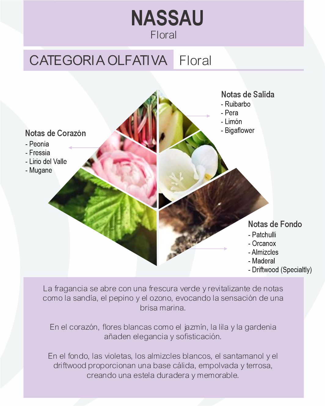 La fragancia comienza con una salida fresca y jugosa de ruibarbo, pera, limón y big flower. En el corazón, flores como peonía, fresia y lirio del valle crean una armonía floral sofisticada. En el fondo, el pachulí proporciona una nota terrosa y sensual, mientras los almizcles añaden suavidad. Esta combinación resulta en una fragancia elegante y distintiva, dejando una estela memorable y duradera.
